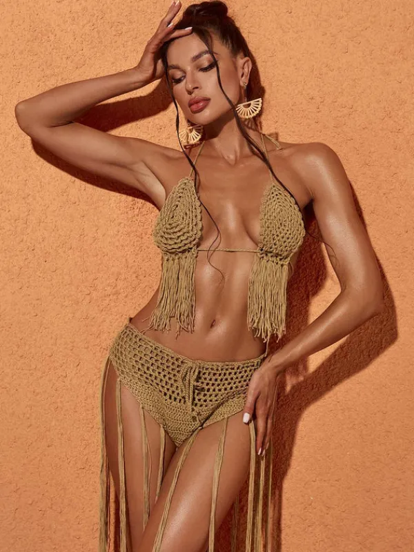 Hit the beach in provocative style with the Berlin Knit Fringe Bikini Two Piece Set In Brown, featuring a halterneck top and knit bottom adorned with fringe. The perfect two-piece set for a daring beach look.