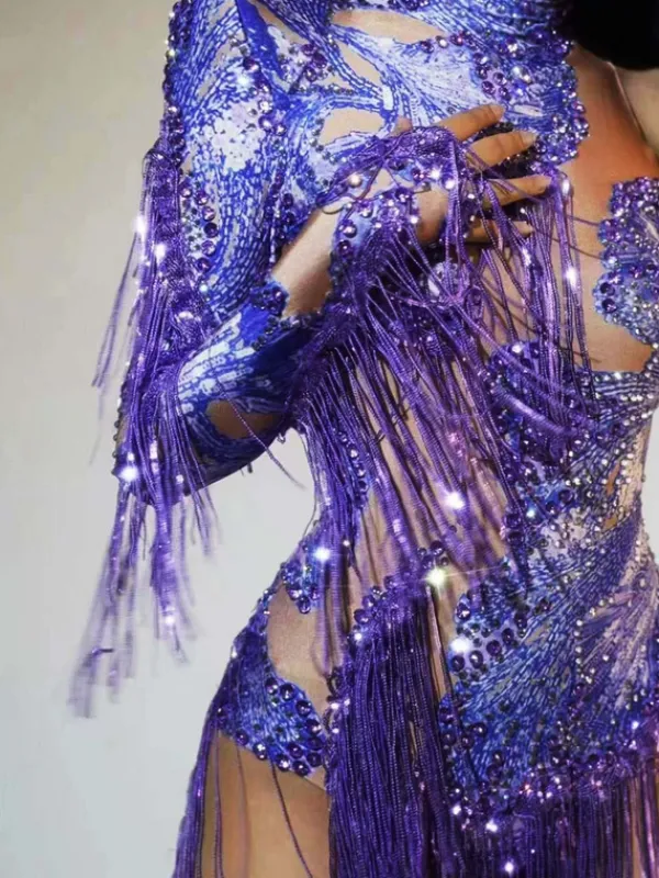 Introducing the Shatora One Shoulder Rhinestone Fringe Bodysuit, designed in a beautiful and bold purple color. Featuring rhinestone accents and fringe details for added flair, this bodysuit is perfect for making a statement and standing out at any event. Elevate your style with this must-have piece!