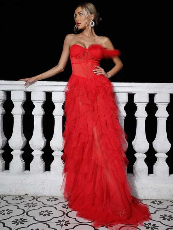 Beautify your special occasion ensemble with the Titania One Shoulder Tulle Maxi Dress In Red. This exquisite maxi dress features a single shoulder strap and a sweeping tulle skirt for a look that is both glamorous and modern. Perfect for any event, the Titania is sure to turn heads.