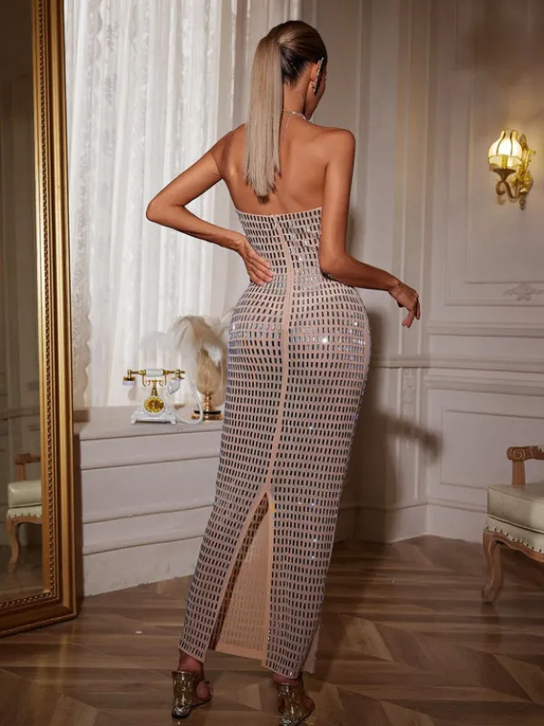 Experience the epitome of elegance with our Ridley Rhinestone Mesh Maxi Dress. The intricate mesh design is adorned with sparkling rhinestones, adding a touch of glamour to any occasion. Elevate your style and exude confidence in this stunning dress.
