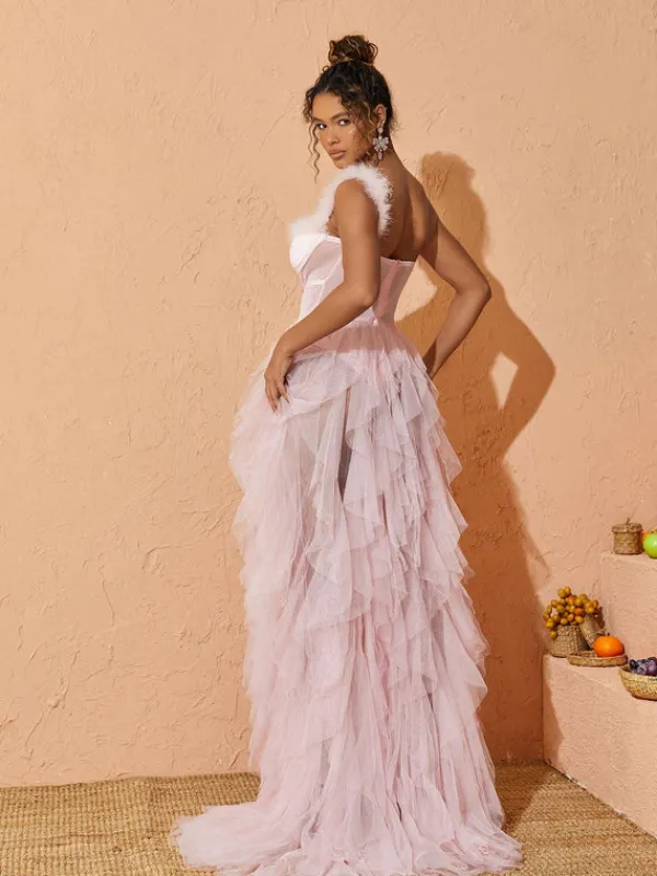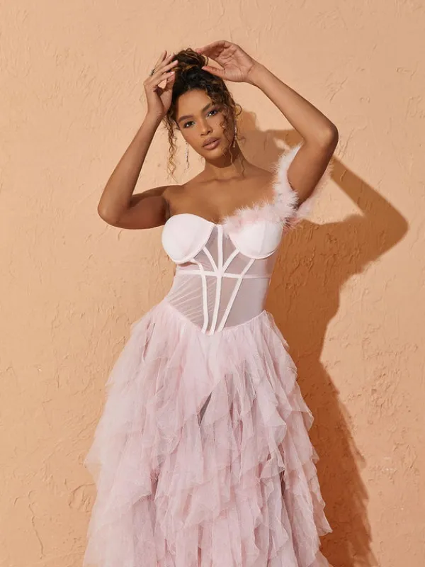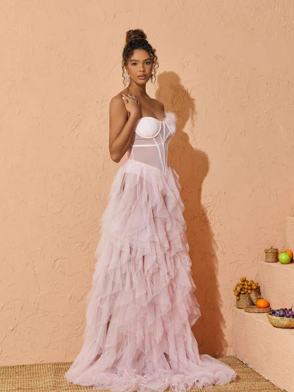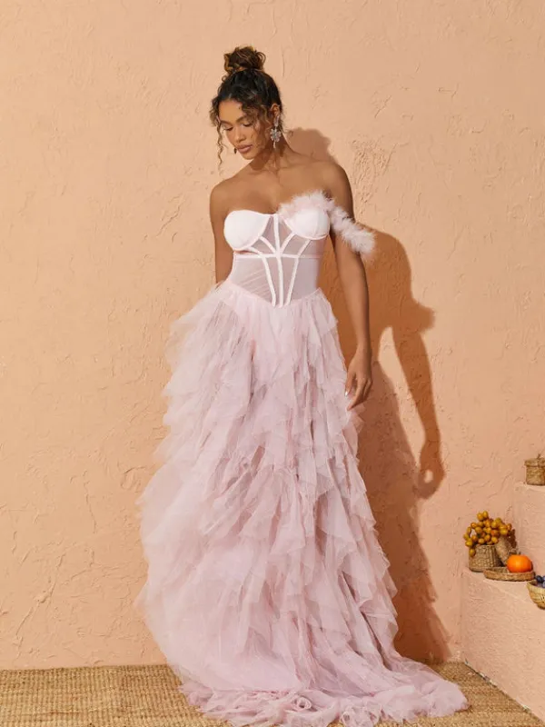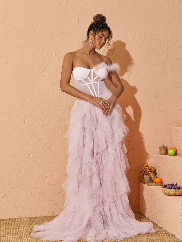 Beautify your special occasion ensemble with the Titania One Shoulder Tulle Maxi Dress In Blush. This exquisite maxi dress features a single shoulder strap and a sweeping tulle skirt for a look that is both glamorous and modern. Perfect for any event, the Titania is sure to turn heads.