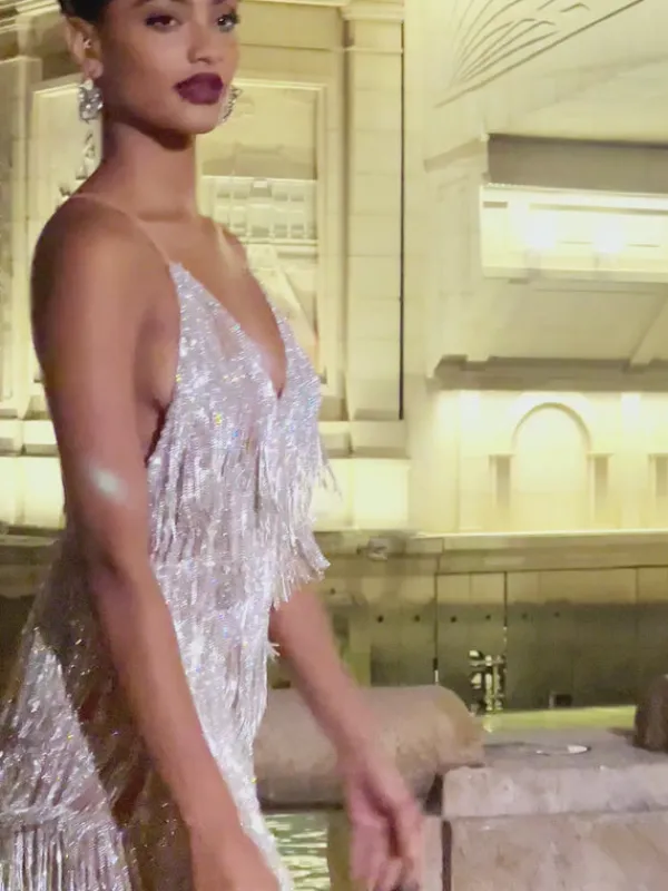 Elevate your fashion game with the Fiadh Crystal Chain Fringe Mesh Mini Dress In Silver. This stunning dress features a mesmerizing crystal chain fringe design, adding an elegant touch to the delicate mesh fabric. Perfect for a night out, this dress will turn heads and make you feel like a true fashion icon.