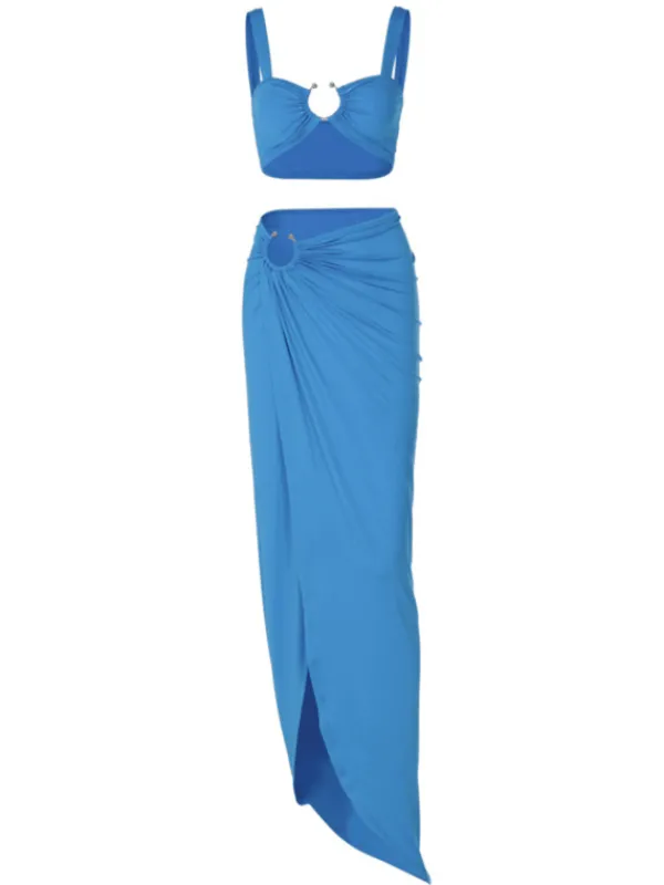 This Metal Hardware Split Skirt Set offers a modern and edgy style. The unique metal hardware design adds sophistication and the split skirt creates a flattering silhouette. Perfect for a night out or a special occasion, this set brings a touch of glamour to any wardrobe.